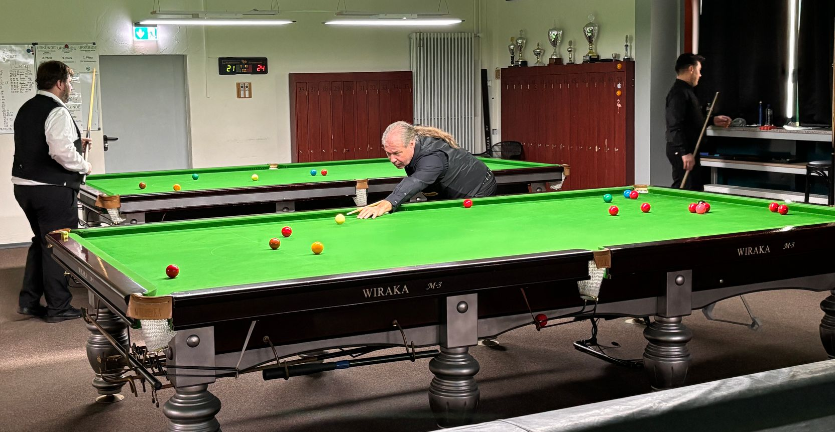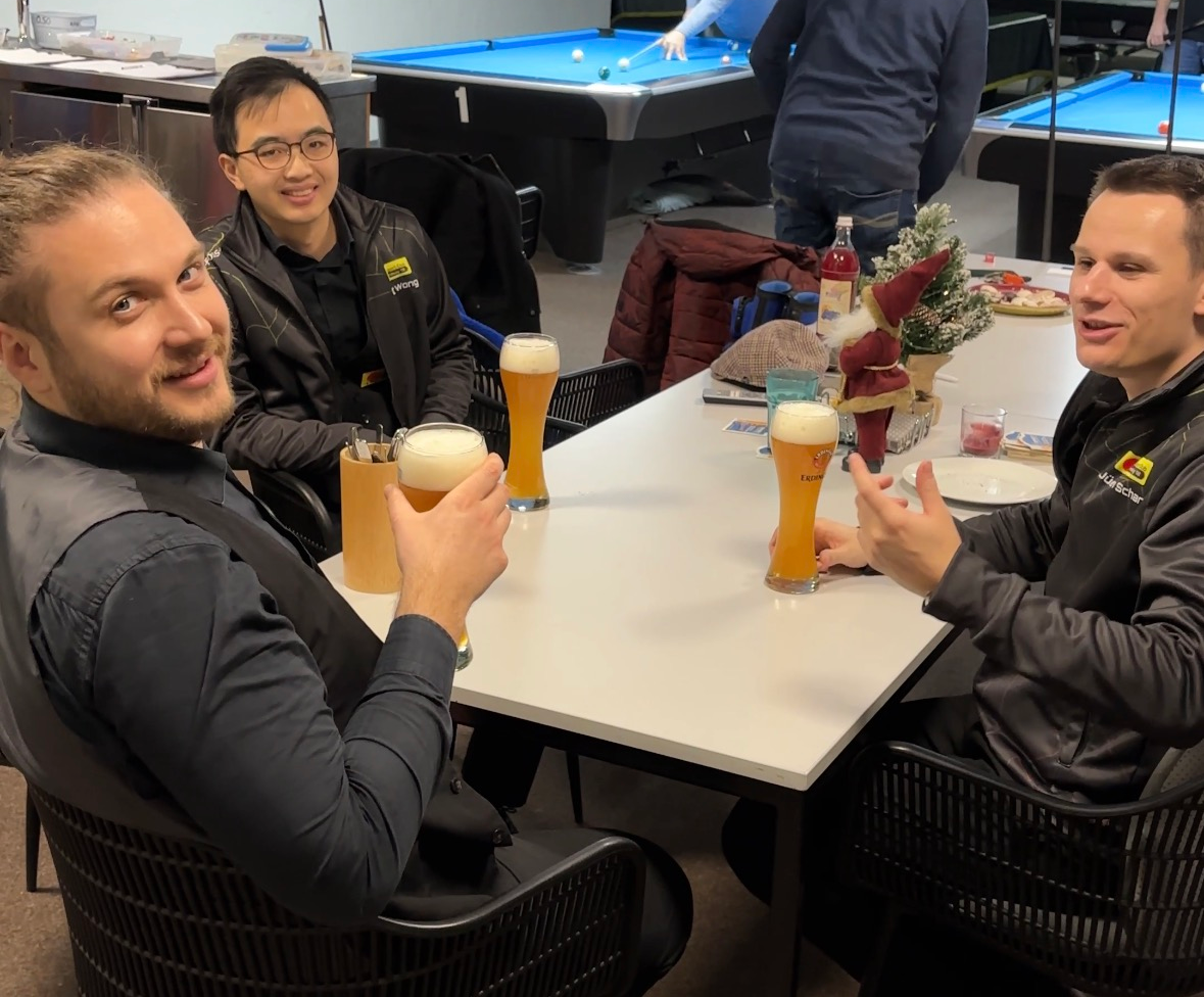 Die ersten beiden Partien gingen klar an Werner und Karim, die mit solidem Spiel früh für eine komfortable Führung sorgten. Christoph traf auf Hasan Kaufmann und verlor den ersten Frame knapp. Im zweiten fand er besser ins Spiel, glich aus und sicherte sich schließlich den Decider – nach spannendem Endspiel auf die Schwarze. Im Duell Werner gegen Markus Leupold stand es schnell 1:0 für Werner, der den ersten Frame mit einer Clearance auf die Farben beendete. Der zweite Frame verlief deutlich ausgeglichener und wurde erneut auf Schwarz entschieden. Markus hatte zunächst die Chance zum Framegewinn, verfehlte jedoch die Schwarze in die Mitte. Werner behielt die Nerven, lochte eine lange Schwarze und holte sich den Sieg.