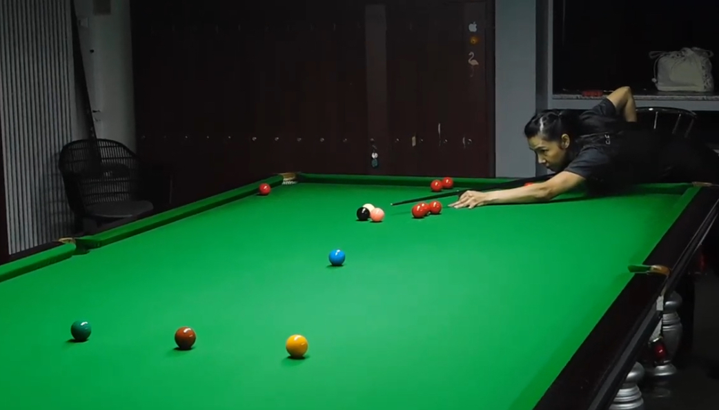 Jinny lochte anschließend die Blaue (40:32) und direkt danach auch die Pinke (40:38). Die Entscheidung musste auf Schwarz fallen. Aus einer sehr schwierigen Position lochte Jinny die Schwarze und schien für einen Moment die Siegerin zu sein – doch auch hier fiel die Weiße. Das bedeutete Foul und damit den Frame- und Tagessieg für Karim.