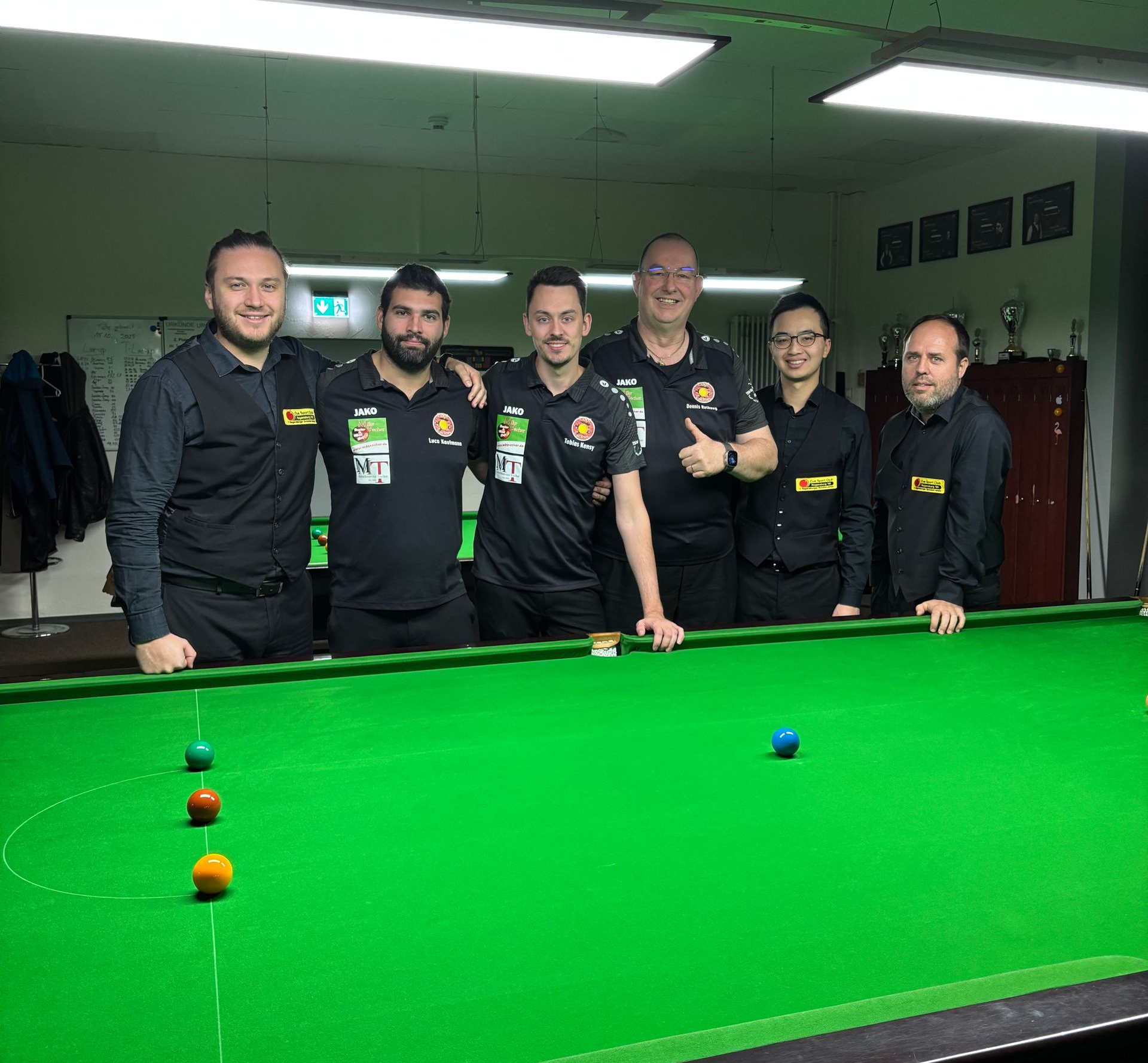 Im zweiten Frame zwischen Robert und Jürgen kam es sogar zu einer Respottet Black. Diese Spielsituation bringt immer einen gewissen Nervenkitzel mit sich. Doch dieses Mal sorgte sie für ein kleines schlechtes Gewissen – denn Robert verfehlte einen Lochversuch und die Schwarze fiel dennoch über drei Banden in die Mitteltasche. Zum Glück ging das Gesamtmatch doch noch an uns.